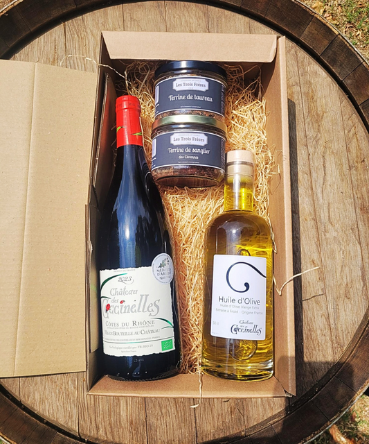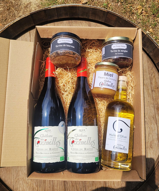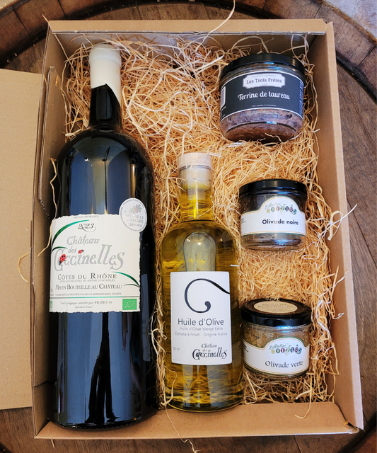 Box - Château des Coccinelles: Rotwein, Weißwein, Olivenöl und Aufstriche